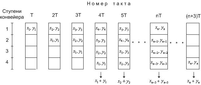 Рис. 1. К примеру 1. Временная диаграмма сложения ( n *1)-векторов вещественных чисел X,Y на 4-х ступенчатом конвейере операции сложения.