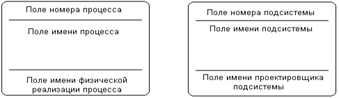 Процесс представляет собой совокупность операций по преобразованию входных потоков данных в выходные в соответствии с определенным алгоритмом. При этом чаще всего подразумевается программная реализация процесса. Процесс на диаграмме потоков данных изображается прямоугольником с закругленными вершинами, разделенным на три поля (рисунок 8, а).