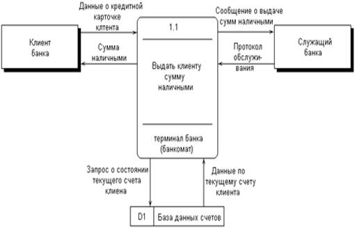 На рисунке 10 приведен пример DF-диаграммы упрощенной модели процесса получения клиентом банка наличных денег по банковской карте. Внешними сущностями являются клиент банка и, возможно, служащий банка, который контролирует процесс обслуживания клиентов. Накопителем данных может быть база данных о состоянии счетов клиентов банка. Отдельные потоки данных отражают характер передаваемой информации, необходимой для обслуживания клиента банка.