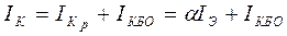 Ток коллектора имеет еще составляющую IКБО, которая протекает в цепи коллектор - база при IЭ = 0 (холостой ход, “обрыв” цепи эмиттера), и не зависит от тока эмиттера. Это обратный ток перехода, создаваемый неосновными носителями областей базы и коллектора, как в обычном p-n переходе (диоде).