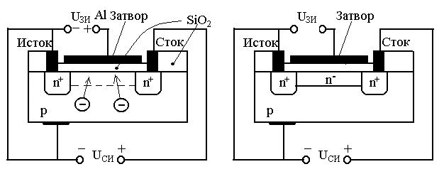 | Рисунок 4.4 Структура МДП ПТ с индуцированным (а) и встроенным (б) каналами. |