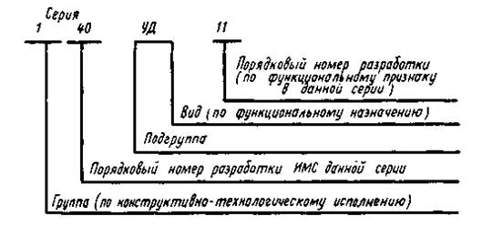Условные обозначения ИМС состоят из четырех элементов (причем первые два элемента - три-четыре цифры - характеризуют полный номер серии):