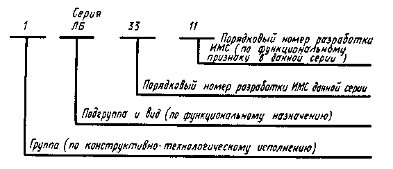 Следует отметить, что до введения ГОСТ 18682 - 73 условные обозначения присваивались в соответствии с нормативно-технической документацией, действовавшей в то время. После 1973 г. большинство ИМС получили новые условные обозначения. Однако ИМС, на которые не была выпущена новая техническая документация, сохранили старые условные обозначения. Пример такого обозначения приведен на рис. 51.