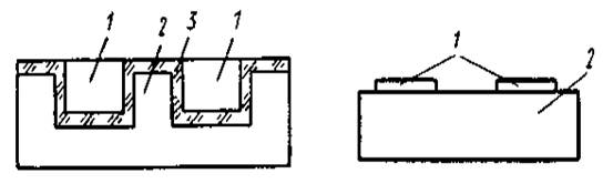 Островковую изоляцию (рис. 60), выполняемую по КНС-технологии (кремний на сапфире), начали применять недавно. При этом на сапфировой подложке выращивают монокристаллическую пленку кремния толщиной несколько микрометров. Затем химическим травлением удаляют кремний в некоторых локальных областях. В результате на сапфировой подложке образуются взаимно изолированные кремниевые островки. Хорошая изоляция островков и малые паразитные емкости позволяют существенно повысить плотность упаковки элементов и повысить быстродействие ИМС на сапфировых пластинах. Основной недостаток островковой изоляции обусловлен сложным рельефом поверхности, затрудняющим получение надежной металлической разводки.