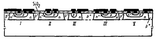Пять вариантов (I - V) построения диодов ИМС на основе планарно-эпитаксиального транзистора показаны на рис. 65. В варианте I использован переход эмиттер - база транзистора при короткозамкнутом переходе база — коллектор; в варианте II — переход эмиттер — база при разомкнутой коллекторной цепи; в варианте III - переход база - коллектор