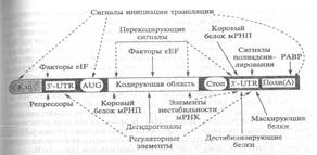 (elF), а также белки-репрессоры трансляции. В инициации трансляции принимают участие также З'-нетранслируемая область (3'-UTR) и поли(А)-хвосты мРНК. В З'-UTR имеются и особые последовательности: сигналы полиаденилирования и сигнал внутриклеточной локализации. С З'-UTR способны связываться маскирующие белки (они делают мРНК недоступной для трансляции рибосомами) и дестабилизирующие белки, контролирующие доступность мРНК для атаки нуклеаз и таким образом определяющие время жизни мРНК в клетке.