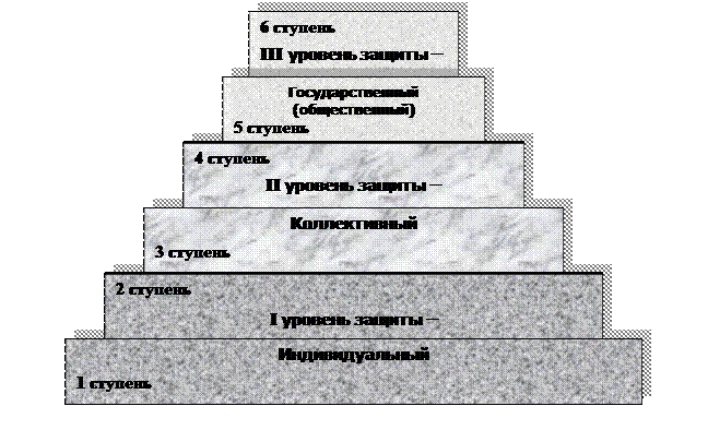 По социальной значимости, все рассматриваемые объекты защиты можно подразделить на три основных уровня защиты – индивидуальный, коллективный и государственный с соответствующей им системой безопасности: личной, коллективной и государственной.