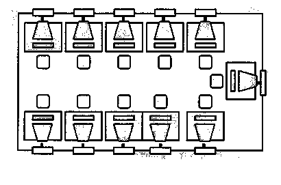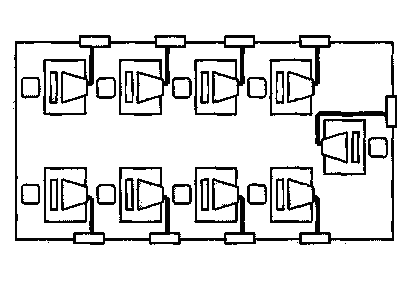 Основной недостаток планировок на рис. 15; 16; 17– это опасность облучения большинства пользователей с тыльной стороны дисплея, установленного на соседнем рабочем месте, а также близость к пользователю элементов сетевого питания соседнего рабочего места либо подключение к единому источнику всех компьютеров, находящихся в помещении.