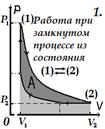 ü Выделяют равновесные процессы — это процессы, состоящие из последовательности равновесных состояний. Они протекают так, что изменение термодинамич. параметров за конечный промежуток времени бесконечно мало. Все реальные процессы неравновесны, но в ряде случаев (достаточно медленные процессы) неравновесностью реальных процессов можно пренебречь. Круговым процессом (или циклом) называют такой процесс, при к-ром ТС после ряда изменений возвращается в исходное состояние ( рис .1). Работа при произвольном замкнутом процессе численно равна площади, охватываемой кривой, описывающей ход цикла, например, на шкале параметров V и P.