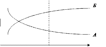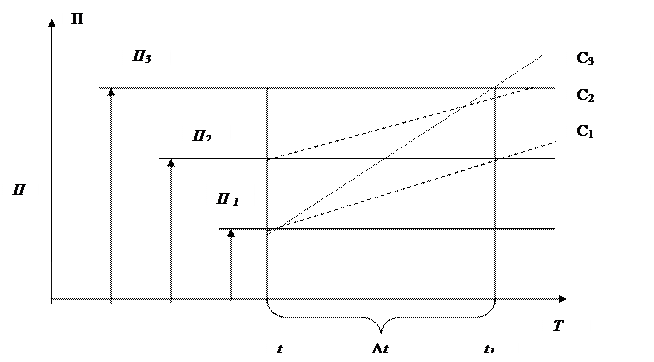 На рисунке видно, что ориентация на качество продукцию конкурента (линия С1) ничего не дает: к моменту его достижения конкурент уходит вперед. Ориентироваться надо на определенный уровень научно – технического прогресса.