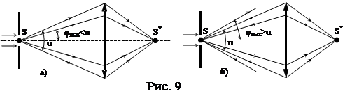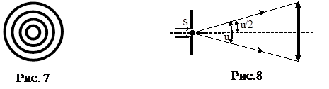 изображение каждой точки предмета, которое формирует линза – объектив, определяется интерференционной картиной, которую мы получаем при дифракции света на этой точке. Эта картина представляет собой центральное светлое пятно, окруженное чередующимися темными и светлыми кольцами (рис.7). Состояние дифракционной картины будет зависеть от соотношения максимального угла дифракции φmax и апертурного угла u объектива. Апертурный угол u – это угол между крайними лучами конического пучка света, идущего от наблюдаемого предмета S в объектив (рис.8).