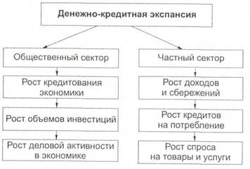 2) денежно-кредитная экспансия (политика «дешевых» денег) означает расширение масштабов кредитования экономики, ослабление контроля со стороны центрального банка за приростом количества денег в обращении, снижение уровня процентных ставок. Ее целями являются стимулирование деловой активности и экономического роста, сокращение безработицы (рисунок 1.2).