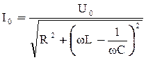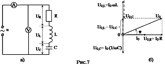 Рассмотрим цепь, состоящую из резистора R, катушки индуктивности L и конденсатора C (рис.7а). Подадим на концы этой цепи переменное напряжение u = U0cosωt. В цепи возникнет переменный ток той же частоты ω, амплитудой I0 и фазой φ, значение которой будет определяться параметрами цепи: сопротивлением R, индуктивностью L и электроёмкостью С. Этот ток вызовет падения напряжений на отдельных элементах участка цепи – U0,R, U0,C, U0,L. Поскольку соединение последовательное, то результирующее напряжение U0 будет определяться векторной суммой напряжений на отдельных элементах (рис.7б). По теореме Пифагора получим: