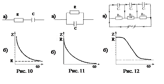 При моделировании электропроводности живых клеток и тканей прибегают к эквивалентным схемам, т.е. к таким комбинациям омического сопротивления и ёмкости, которые в некотором приближении могут отражать характер течения тока и значения электрических параметров клетки и тканей. Простейшими из таких моделей являются схемы с последовательным и с параллельным соединением R и C – (рис.10а и 11а). Но эти простейшие схемы не отражают истинного положения дел, т.к. графики зависимости Z от ω противоречат данным по живым тканям (сравните рис.10б, 11б и рис.6, кривая1).