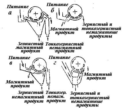 В зависимости от типа устройства для транспортирования магнитного продукта из зоны действия магнитной силы различают барабанные, валковые, роликовые, дисковые, ленточные, шкивные и другие сепараторы.