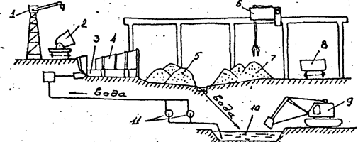 Рис. 6.5. Схема гидрожелобной установки для производства гранулированного шлака: I – копер; 2 – шлаковозный ковш; 3 – грануляционный желоб; 4 – паросборник; 5 – площадка предварительного обезвоживания шлака; 6 – грейферный кран; 7 – склад гранулированного шлака; 8 – железнодорожный загон; 9 – экскаватор; 10 – отстойник; 11 – насос