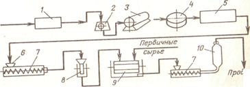 1 —узел сортировки отходов; 2 — дробилка; 3 — моечная машина; 4 — центрифуга; 5 — сушилка; 6 — питатель; 7 — экструзионные прессы; 8 — гранулятор; 9 — смеситель; 10 — гшеночный агрегат