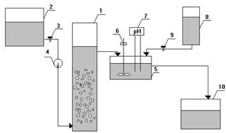 Установка (рис. 3.1.) состоит из реактора (1) (диаметр 40 мм, высота 400 мм), емкости соляной кислоты (2), кранов (зажимов) (3) и (9), расходомера (4), нейтрализатора (5) объемом 50-100 см3, мешалки с электродвигателем (6), рН-метра (7), емкости раствора едкого натра (8), емкости раствора хлористого кальция (10) объемом 100‒500 см3.