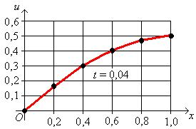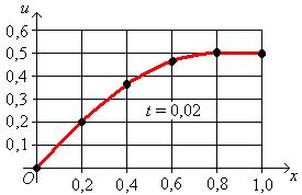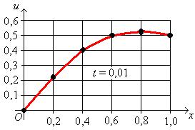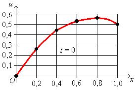 Замечание. При решении конкретной задачи для того, чтобы контролировать правильность хода решения и для того, чтобы нагляднее представить характер распространения тепля с стержне (либо другой физической величины, если рассматривается другой физический процесс) удобно представлять графически результаты расчета на каждом слое сетки (начать следует с графического представления начального условия).