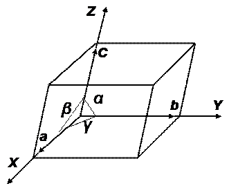 Упорядоченное или строго регулярное пространственное расположение атомов вещества характеризуется тем, что существуют такие три вектора a, b, c, образующие между собой углы α, β, γ (рис. 1), что любое трансляционное смещение