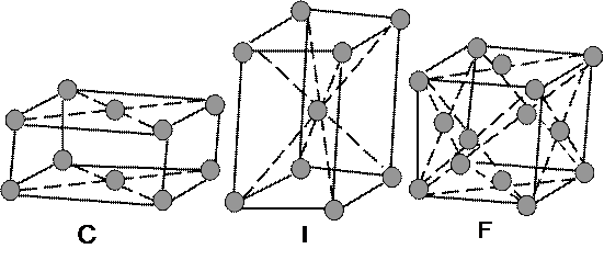 | Ромбическая | a ≠ b ≠ c | α = β = γ ≠ 900 | P, I, F, C |