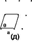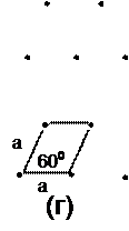 Рис. 3. Пять решеток Бравэ для двумерного случая с выделенной элементарной ячейкой: квадратная (а), простая прямоугольная (б), центрированная прямоугольная (в), гексагональная (г), косоугольная (д).