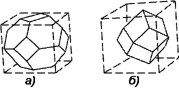 Существует еще один способ построения примитивной элементарной ячейки кристаллической решетки, которая содержит один единственный атом и представляет собой многогранник. Такие элементарные ячейки все вместе полностью заполняют все пространство. Такая элементарная ячейка называется ячейкой Вигнера-Зейтца и строится она следующим образом. Берется произвольный атом, от него проводятся линии ко всем ближайшим атомам и через середину этих линий проводятся перпендикулярные им плоскости. Пересечение этих плоскостей образует многогранник, который и называется элементарной ячейкой Вигнера-Зейтца данной кристаллической решетки. На рис. 4 показаны ячейки Вигнера-Зейтца для объемно-центрированной и гранецентрированной кубической решетки. Они представляют собой тетракондекаэдр (усеченный правильный октаэдр) и ромбический додекандер соответственно.