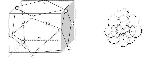 Теперь поговорим о том, каким образом формируется та или иная регулярная кристаллическая решетка твердого тела. Наверно устойчивость кристаллической структуры будет определяться минимумом потенциальной энергии взаимодействия атомов и молекул. Рассмотрим простейшую модель, в которой атомы представляются в виде твердых шаров. Такая модель достаточно хорошо описывает кристаллическую решетку металлов, где положительно заряженные ионы «стягиваются» в плотноупакованную структуру за счет взаимодействия с отрицательно заряженным электронным газом. Сами же ионы отталкиваются друг от друга за счет кулоновского взаимодействия. Так как и притяжение, и отталкивание атомов в этом случае является изотропным, то модель твердых шаров является вполне адекватной. Минимум потенциальной энергии будет достигаться, если шары будут заполнять большую часть свободного пространства, и каждый шарик должен при этом взаимодействовать как можно с большим числом других шаров.