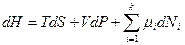 , качестве термодинамического потенциала может быть введена также энтальпия Н(S,р,Nk). Она является функцией одного интенсивного (р) и двух экстенсивных (S,Nk) параметров. В интегральной и дифференциальной форме уравнения для энтальпии записываются следующим образом: Н=U+pV и