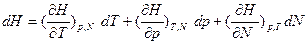 . Однако, применение энтальпии как термодинамического потенциала не удобно, так как функция Н (S,р,Nk) содержит энтропию в качестве независимой переменной, которую невозможно контролировать. Поэтому в классической термодинамике энтальпию, по аналогии с внутренней энергией, обычно представляют (в общем случае для многокомпонентной системы) как функцию двух интенсивных (T,р) и одной экстенсивной (N) переменных, которая не является характеристической функцией, так какизменение этой функции (ее полный дифференциал) представляет собой дифференциальное уравнение первого порядка в частных производных: