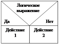 3. Блок решения – для обозначения структуры разветвления. Условие располагается в верхнем треугольнике, варианты решения – по сторонам треугольника, а процессы обработки – прямоугольниками. Если блок решения является сокращенным (отсутствует одна из ветвей), то структурограмма видоизменяется соответствующим образом.