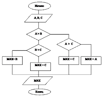 Пусть надо найти МАХ –е из трех чисел А, В и С.
