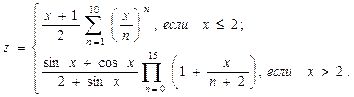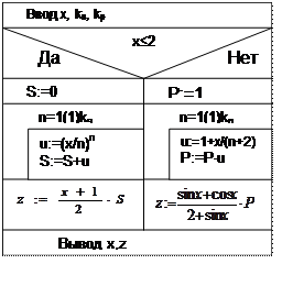 В зависимости от значения переменной x реализуется вычисление суммы или произведения. Вычисление суммы целесообразно реализовать с помощью оператора цикла с параметром n. В теле цикла необходимо вычислить значение очередного слагаемого un=(x/n)n при текущем n и осуществить накопление суммы по формуле Sn=Sn-1+un. Подобные операции требуется выполнить для n=1(1)10. Так как нет необходимости запоминать значения всех слагаемых u1,u2,...,u10 и конечных сумм S1,S2,...,S10, то в качестве Sn и un можно использовать скалярные переменные S и u. При этом накопление суммы можно реализовать с помощью операции S:=S+u. Перед выполнением цикла значение переменной S должно быть нулевым (S:=0).