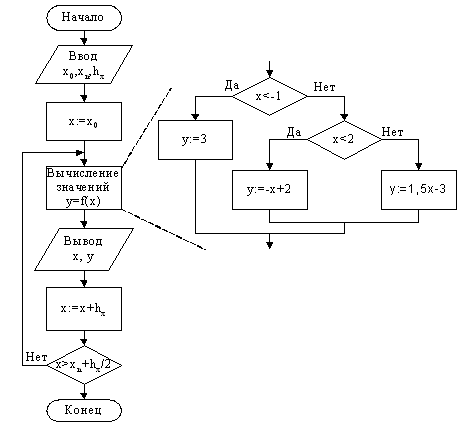 . Для каждого значения аргумента вычисляется функция и производится вывод текущих значений. Тогда схема алгоритма будет иметь вид: