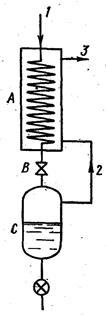 В вентиле В газ адиабатически дросселируют до давления, близкого к атмосферному. При этом он охлаждается. Если понижение температуры недостаточно для сжижения газа, то его по трубопроводу 2 возвращают в теплообменник А, где он охлаждает новые порции сжатого газа и выбрасывается через трубопровод. Таким образом, постепенно понижается температура газа за вентилем В, пока, наконец, не начинается сжижение газа. Сконденсированный газ собирается в сосуде С.