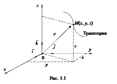 проведенным из некоторой неподвижной точки О выбранной системы отсчета в точку М (рис. 1.1). При движении точки M ее радиус-вектор меняется в общем случае как по модулю, так и по направлению, т. е. радиус-вектор точки M зависит от времени t. Геометрическое место точек, соответствующих окончанию радиуса-вектора