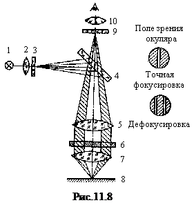 Более высокую точность фокусировки можно получить нониальным или биссекторным методом (рис. 11.8). Источник 1 через конденсор 2 освещает сетку 3 (например, прозрачный штрих на темном поле), которая зеркалом 4, линзой 5 и объективом 7 фокусируется на объект. Между линзой 5 и объективом 7 в автоколлимационной схеме располагают маску 6. Ее автоколлимационное отражение в плоскости сетки 9 наблюдается в окуляр 10. При точной фокусировке в поле зрения наблюдается один штрих. При неточной фокусировке отображение маски раздваивается и следует добиться нониального или биссекторного совмещения обоих штрихов.