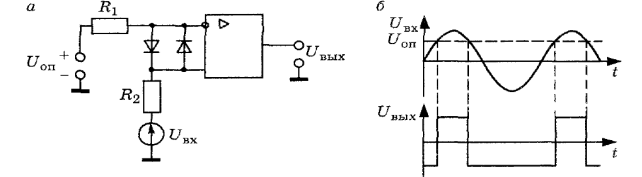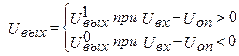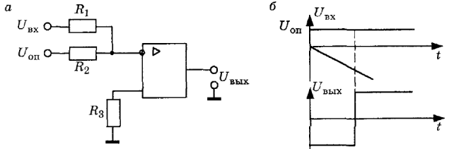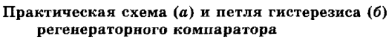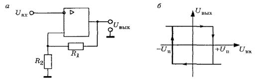 Пусть опорное напряжение равно нулю. Если R1<<R2, то на входе будет напряжение положительной обратной связи. Смена состояния выходного уровня происходит, когда входное напряжение превышает по абсолютной величине пороговое напряжение