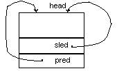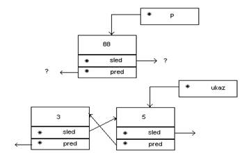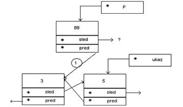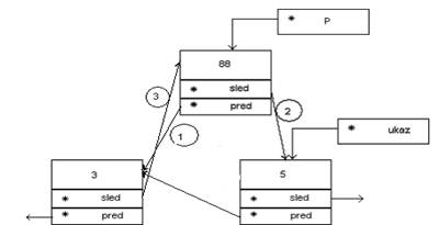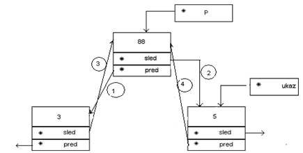 4.Установка связей между элементами: 4.1. p^.pred:=ukaz^. pred (p^.pred будет указывать на тот элемент, на который указывает ukaz^.pred);