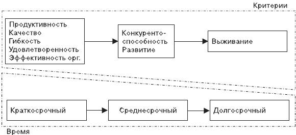 Поведение организации должно быть эффективным. При рассмотрении эффективности будем исходить из того факта, что основная задача менеджмента организации – дать возможность этой организации существовать на рынке продолжительный период времени. В контексте ОП эффективность определяется как оптимальное соотношение производительности труда, удовлетворенности работников, конкурентоспособности организации и развития и определяется рядом критериев: краткосрочными, среднесрочными и долгосрочными [1]. Взаимосвязь критериев эффективности во времени представляет собой временну ю модель эффективности (рис. 1.5.1).