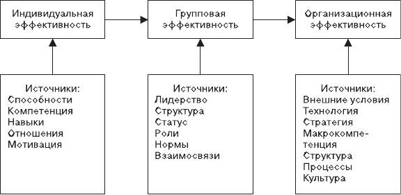 Источники организационной эффективности представляют собой сложное взаимодействие индивидуальной и групповой эффективности с учетом синергетического эффекта. Кроме того, на организационную эффективность оказывают воздействие внешние условия существования организации (состояние экономики, конъюнктура рынка, отношения с партнерами и пр.); используемые технологии и уровень технического оснащения организации. Индивидуальная эффективность – результат выполнения работником поставленных задач с учетом затрат на их реализацию. На индивидуальную эффективность влияют: квалификация специалиста, его способности, умение, навыки самоорганизованности, степень его заинтересованности в работе (уровень мотивированности); отношения, которые существуют в организации, стрессовые нагрузки, возникающие при выполнении заданий.