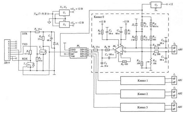 На рисунке обозначено: М1 - DS2450, М2 – INA114BP; Т1, Т2 - 2N7000; Д1, - стабилитрон на 5 В, Д2 - 1N414B; U1и U2 - TMA0512S, U3 - REF02CP.