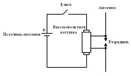 В радиопередатчике Попова использовался единственно известный в то время принцип получения колебаний высокой частоты - с помощью искрового разряда. Отсюда название таких передатчиков - искровые. Упрощенная схема радиопередатчика приведена на рисунке 2.