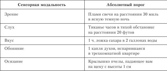 Мы видим, как солнце восходит на востоке и заходит на западе, но на самом деле оно никогда не восходит и не заходит. Известно, что очевидцы часто совершенно по-разному «видят» сцену преступления и, соответственно, дают различные показания. Данные феномены восприятия иллюстрируют тот факт, что воспринимаемый мир – не реальный мир, тем не менее – это мир, который мы знаем и на который мы соответственно реагируем. Воспринимаемый мир есть чувственное отражение реального. Это ощущение так сильно, что мы редко задаемся вопросом, что мы видим. Вообще говоря, когда другие люди воспринимают вещи не так, как это делаем мы, мы часто полагаем, что они либо неразумны, либо не правы. Воспринимаемый мир – это фрагмент реального, воспринимаемый человеком с помощью пяти органов чувств: зрения, слуха, вкуса, осязания и обоняния, которые имеют существенные физические ограничения, предохраняющие от переизбытка информации и позволяющие поэтому лучше воспринимать необходимую информацию. Табл. 2.1.1 дает представление о природной ограниченности наших органов чувств. Работая в качестве фильтра, восприятие позволяет человеку отобрать и увидеть только те элементы внешней среды, которые относятся к данной ситуации, т. е. фокусируя и определенным образом организуя часть элементов внешней среды в ситуацию.