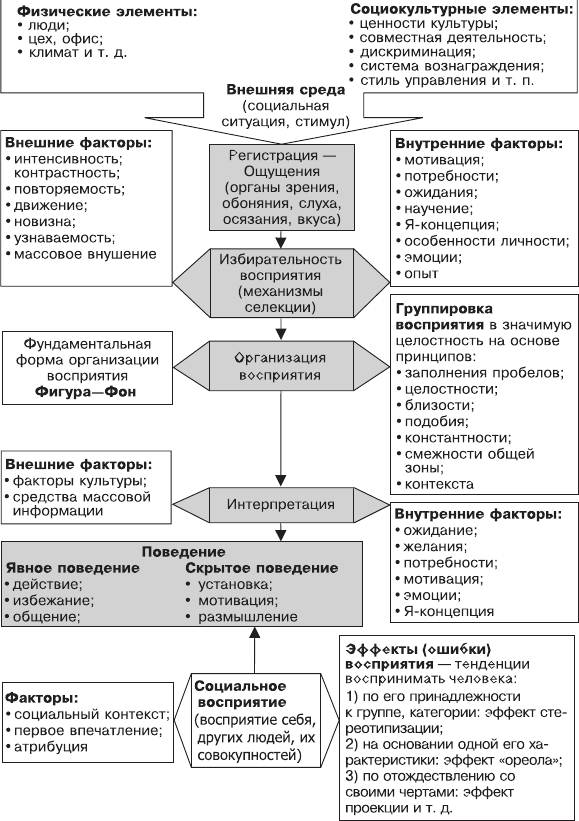 Внутренние факторы восприятия. Мы уже отмечали, что восприятие зависит не только от характера воспринимаемого стимула (объекта), но также и от общего содержания психической жизни самого субъекта, поскольку воспринимает конкретный живой человек с присущими ему личностными особенностями. Такими наиболее важными внутренними факторами являются перцептивные ожидания (установка), Я-концеп-ция, перцептивная защита, знания, личностные особенности, эмоциональное состояние, потребности и мотивация деятельности, цели и задачи, жизненный и профессиональный опыт.