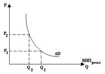 График показывает, что на макроуровне выполняется закон спроса: при повышении общего уровня цен (Р1®Р2), количество благ, запрашиваемое покупателями, снижается (Q1®Q2), и наоборот.