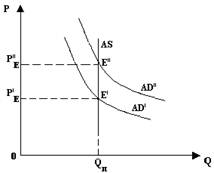 Увеличение совокупного спроса (AD' ® AD") на классическом отрезке (рис.9б) повышает только цены (P"Е>Р'Е), оставляя постоянным уровень национального производства (Qп), т.к. экономика в данном случае не может выйти за пределы своих потенциальных возможностей (условия полной занятости). Это, как и в предыдущем случае, свидетельствует об инфляции спроса.