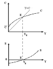 Наклон кривых С и S в каждой точке определяется тангенсом угла наклона касательной к этой точке. Причем в экономическом смысле тангенс угла наклона представляет собой предельную склонность к потреблению или сбережению. При этом убывающий характер MPC определяет уменьшающийся наклон кривой С, а растущий характер MPS – становящийся все более крутым подъем кривой S (при постоянных значениях MPC и MPS графики С и S имеют линейный вид).