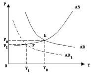 В случае уменьшения совокупных расходов (рис.30а) происходит смещение кривой AD влево, объем выпуска и цены снижаются. При этом, сокращение выпуска сопровождается ростом безработицы и недогрузкой производственных мощностей.