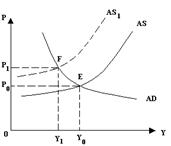 Кривая AS сместилась в положение AS1 (рис.30б), вызвав сдвиг краткосрочного равновесия с точки Е в точку F. Это привело к сокращению производства, безработицы и росту уровня цен (инфляции).